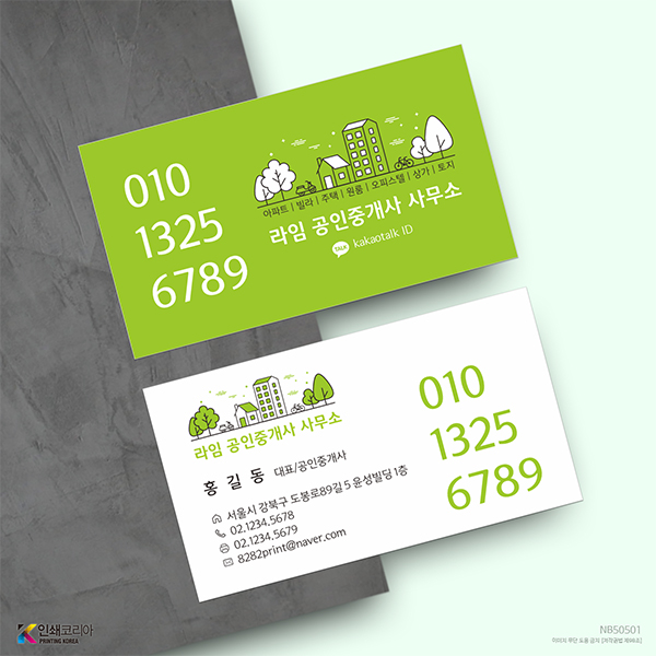다른 면은 화이트 배경의 여백을 충분히 활용하여 정갈하고 깨끗한 이미지를 강조했습니다. 컬러 일러스트를 상단에 배치하여 앞면과의 통일성을 유지하고, 성함과 상세 연락처를 질서 있게 배열하여 신뢰감을 주는 전문가의 인상을 구축했습니다. 이 디자인은 부동산명함 및 공인중개사명함은 물론, 자연 친화적인 가치를 추구하는 인테리어 디자인, 조경 설계 사무소, 전원주택 건축, 가구 공방, 친환경 기업 등 정겨운 주거 환경과 관련된 다양한 업종에 적극 추천합니다.