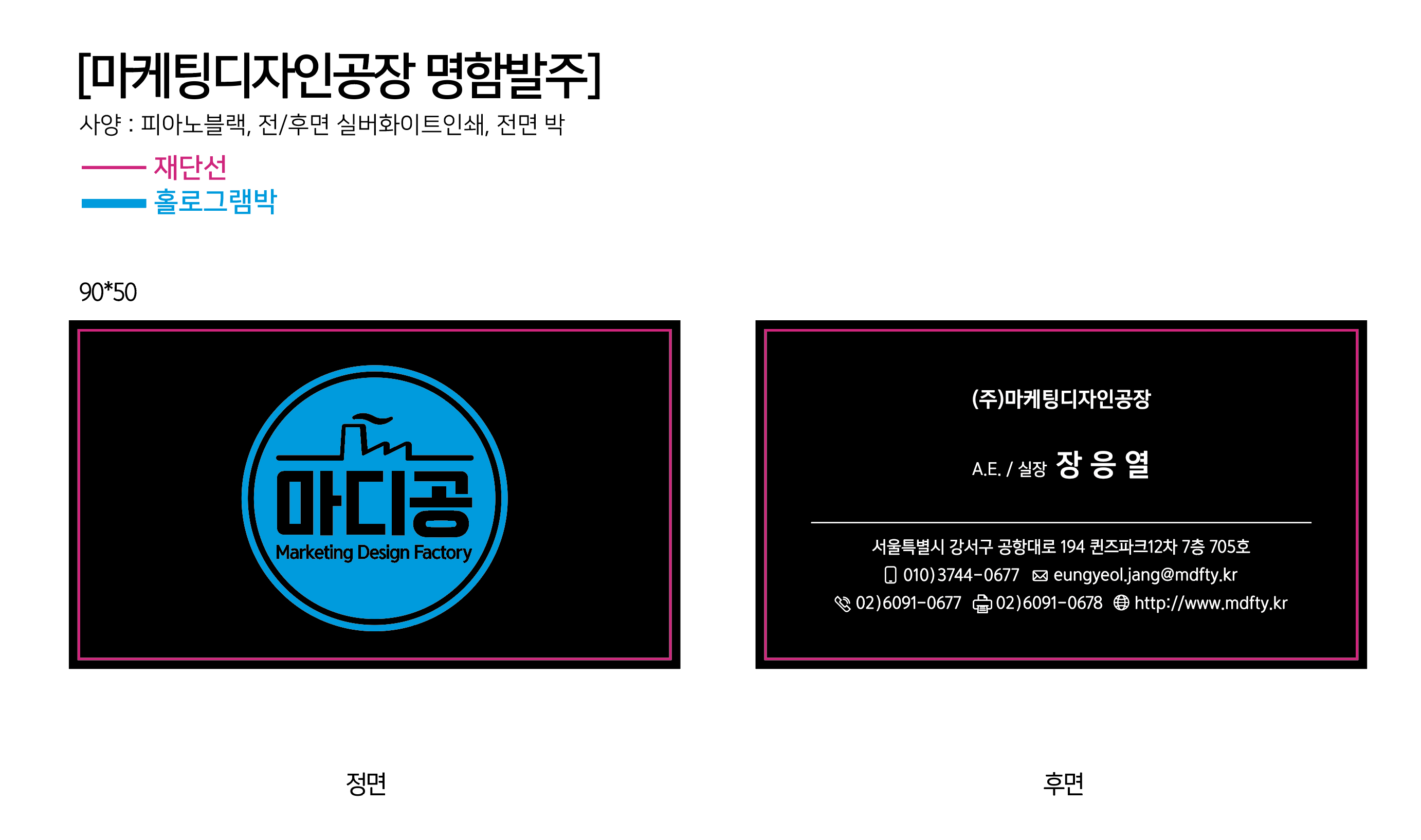 전면에 마디공 글자아래 영어부분(Marketing Design Factory)이 깔끔하게 나왔으면 하거든요~