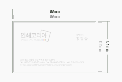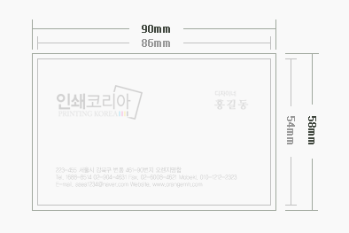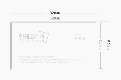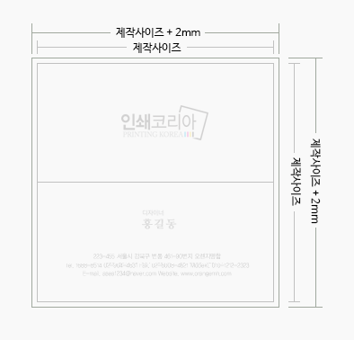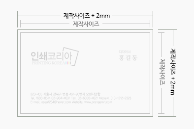 - 비규격사이즈로 명함제작을 원하시는 경우 제작하려는 사이즈 보다 가로, 세로 각각 2mm씩 크게 작업하시면 됩니다.