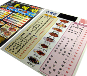 배달업종에서 많이 제작하는 스티커입니다. 앞면은 내용이 인쇄되며 뒷면에는 작은 고무자석이 붙어있습니다.