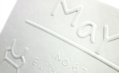 형압은 명함의 한쪽면(보통 앞면이 튀어나오게 함)에서 압력을 가하여 특정한 모양이 볼록 튀어나와 입체감을 주는 후가공입니다.